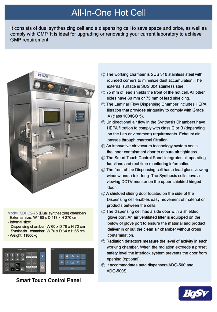 It consists of dual synthesizing cell and a dispensing cell to save space and cost, as well as comply with GMP guidelines.