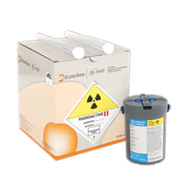 Type I glass vial with bromobutyl rubber stoper in lead shield in a box