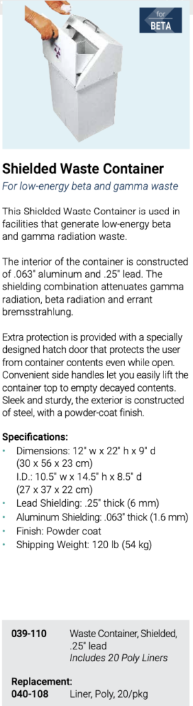 This Shielded Waste Container is used in facilities that generate low-energy beta and gamma radiation waste.