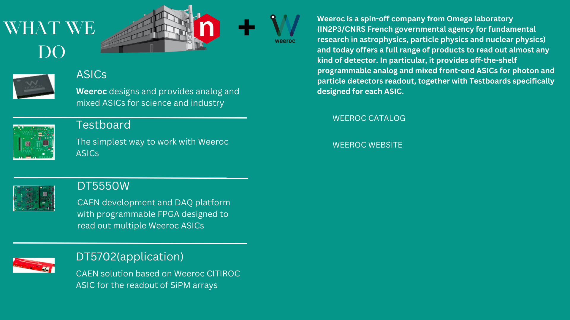 Weeroc main customers are the major actors in the fields of: • Medical imaging • Homeland security • Nuclear protection…